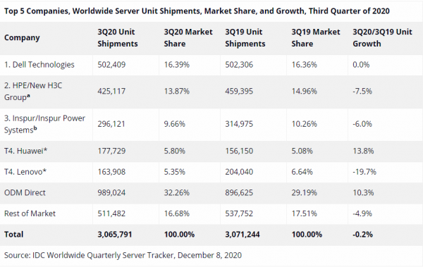 该季度戴尔和HPE/新华三以20.7%和15.9%的收入份额在全球服务器市场并列第一。浪潮/浪潮商用机器以9.4%的收入份额位列第三。联想以5.9%的份额位列第四,华为以4.9%的份额位列第五。ODM Direct服务器厂商综合占比28.0%,同比增长8.4%。